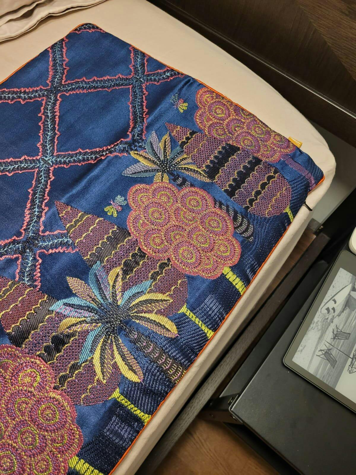 Woven in the heritage Banarasi Gyasar technique, this pillow is a nocturne in silk: a dreamscape of stylized cypresses and palm trees in jewel-tones is woven into celestial violet silk. And there - woven into the very architecture of the cloth - the fireflies mid-dance, eternal keepers of light in a moonless glade.